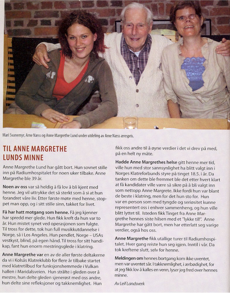 Pål Winsents: Ruth Astrid L. Sæter: Kjære Anne Margrethe, Jeg rakk dessverre ikke å treffe deg så mange ganger - men jeg følte likevel at jeg ble ganske godt kjent med deg. Jeg tror det skyldes måten du møtte meg på. Med hele sanseapparatet åpent, med nysgjerrighet, varme og ærlighet tok du imot meg - slik jeg tror du møtte alle du hadde foran deg. For jeg opplevde deg som genuint opptatt av alt og alle rundt deg; hva vi drev med, hva vi tenkte, hvordan vi hadde det. Du levde som du preket, med stor værekraft og livsglede. Du tilhører den kategorien mennesker som setter spor. Fordi du våget å være den du var, fordi du levde ut det du trodde på. Du forsvant så altfor tidlig. Men det er vel sånn livet - og døden - opererer; uten omtanke til tomrommet og savnet som blir igjen. Trøsten er at tankene dine, prosjektet ditt og det du sto for lever videre. Det er også en stor trøst å vite at smertene ikke lenger kan nå deg. Takk, Anne Margrethe, for alt du ga! ----------------------------------------------------- Det er uvirkelig å tenke på at