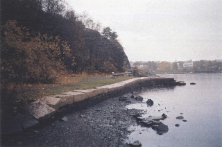 17 - Bryggeanlegg ved Frognerkilen Står ikke på på gul liste "I området som betegnes H3 og omfatter kollen sørøst for Rohdeløkken Kafé mot Thulstrups løkke og Oscarshall ble det registrert et bredt utvalg av kulturplanter. Dette er sannsynligvis restene etter Paul Thranes "landskapspark". Mot sjøen er det en kraftig mur av granittblokker og rester av et bryggeanlegg. Muren er dessverre i svært dårlig forfatning og deler av den er i ferd med å rase ut." (Hilmersen/Øverbø) Fergen fra Skarpsno ankom Bygdøy på dette stedet i gamle dager.