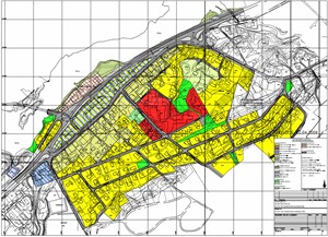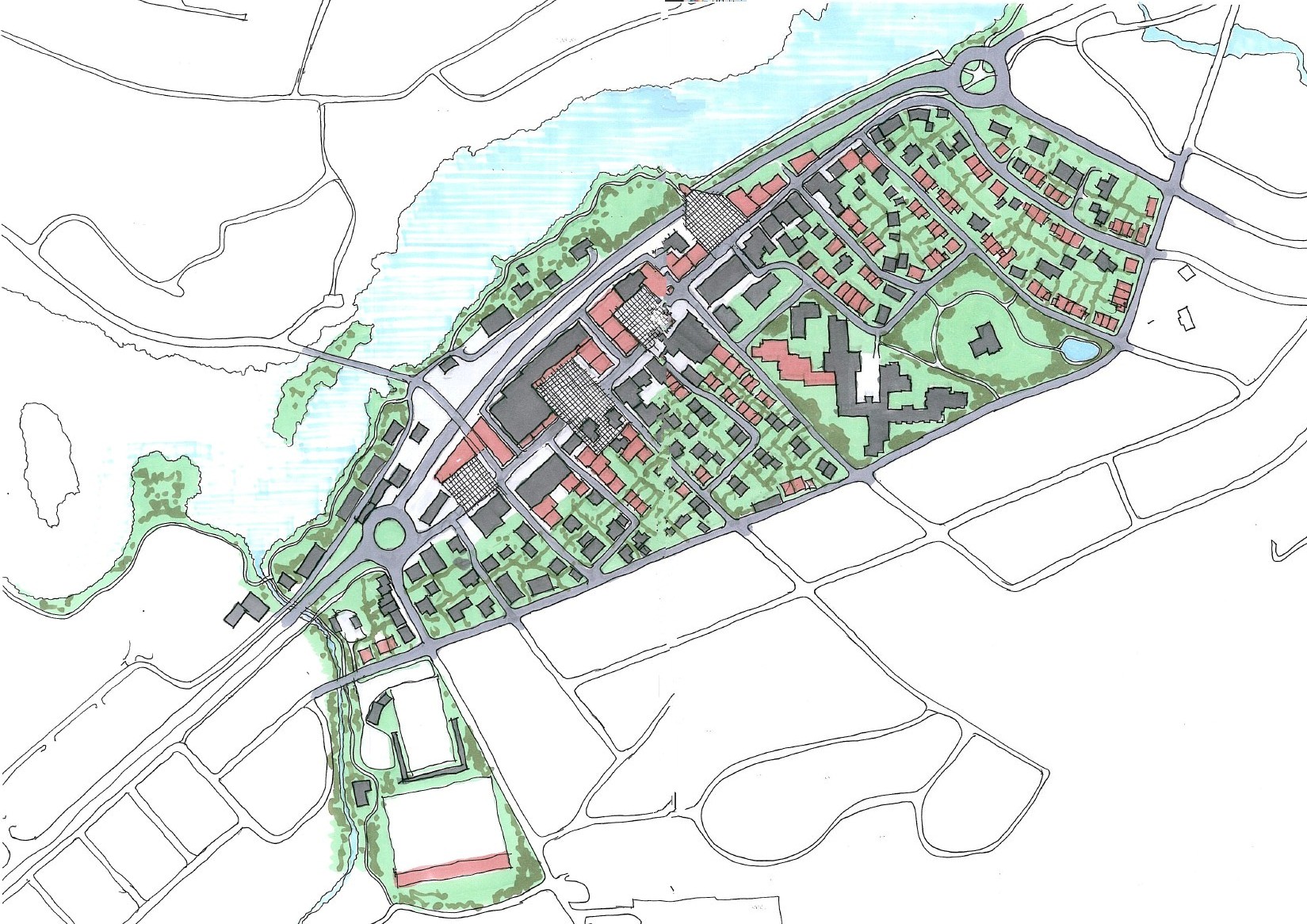 rundkjøring er tenkt med mulig rådhus som signalbygg. Hovedgaten