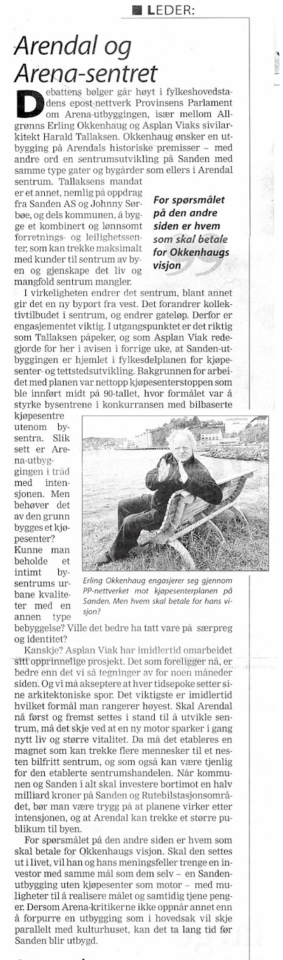 I lederartikkel av 29/10-2002 i Agderposten (klippet fra avisen her) fortelles at PP-nettverket har en bølgende debatt gående om Arena-utbyggingen. Men det vises ikke til noen av argumentene som fremføres i denne debatten. Lederen gir oss kun noen ukritiske beskrivelser i form av små klakkør-pip som ekko fra utbyggernes retorikk. Arendal hadde fortjent at distriktets avis hadde forstått sin rolle og tatt noen av de spørsmål som reises i debatten på alvor for så å bevilge seg å foreta et stykke journalistisk håndverk, å belyse fra flere sider en så vesentlig sak som arenautbyggingen er for Arendal by. Når Arendal kommune har solgt en tomt som må sies å være indrefiléten i fylkeshovedstaden er det oppsiktsvekkende at man på lederplass stiller spørsmål om hvem som vil betale for en visjon. Jeg er sikker på at svært mange investorer hadde kjøpt tomtegrunn på Sanden til samme gunstige pris som investoren Sørbøe uten å plage andre med kostnadene for å gjennomføre en visjon for byen.