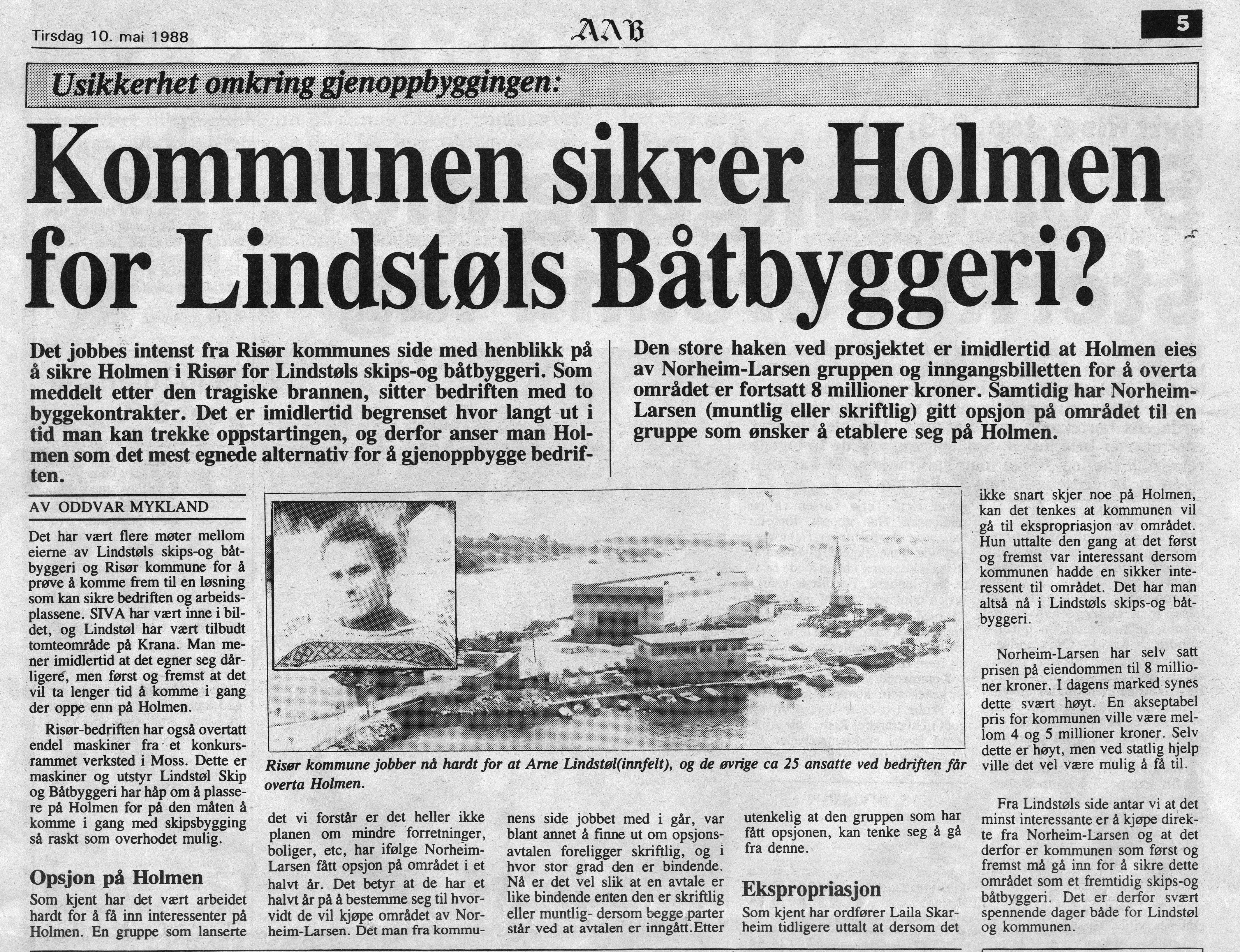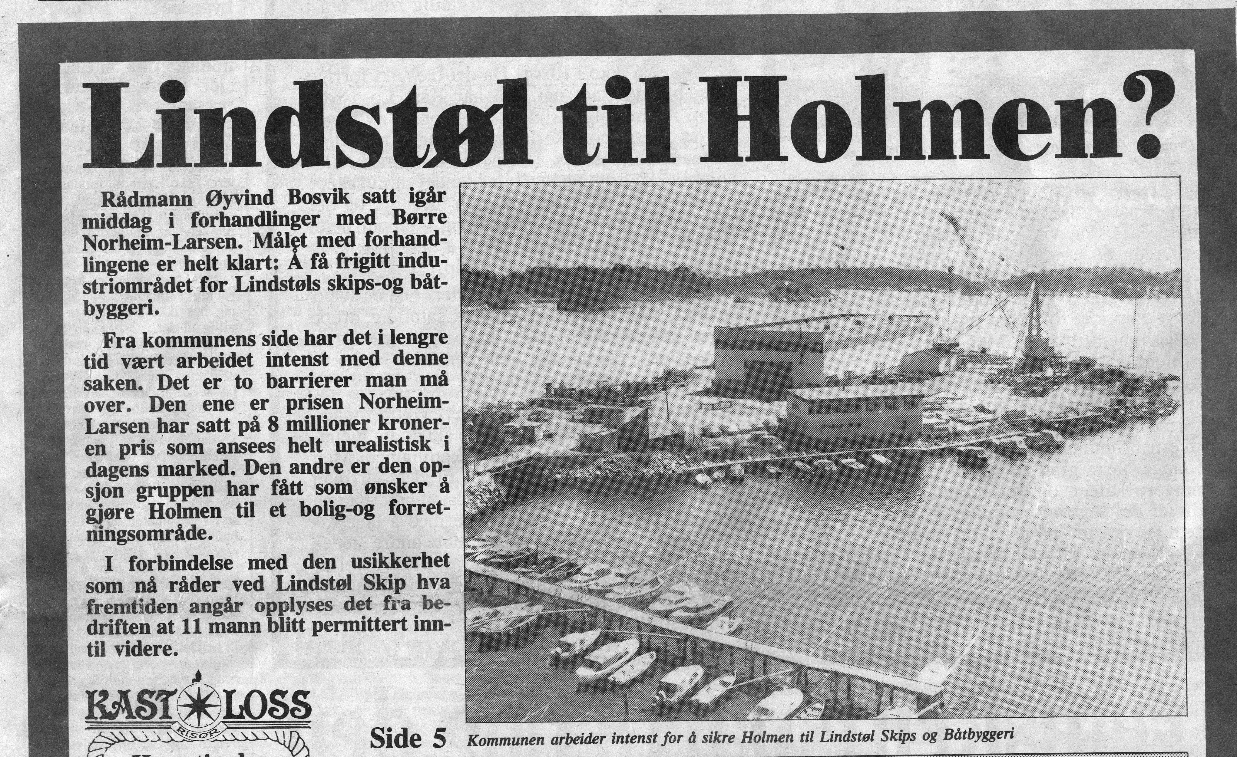 Kortversjonen kan være som følger: Lindstøl Båtbyggeri fikk kjøpe eiendommen Holmen av Risør Kommune i 1989 uten at det